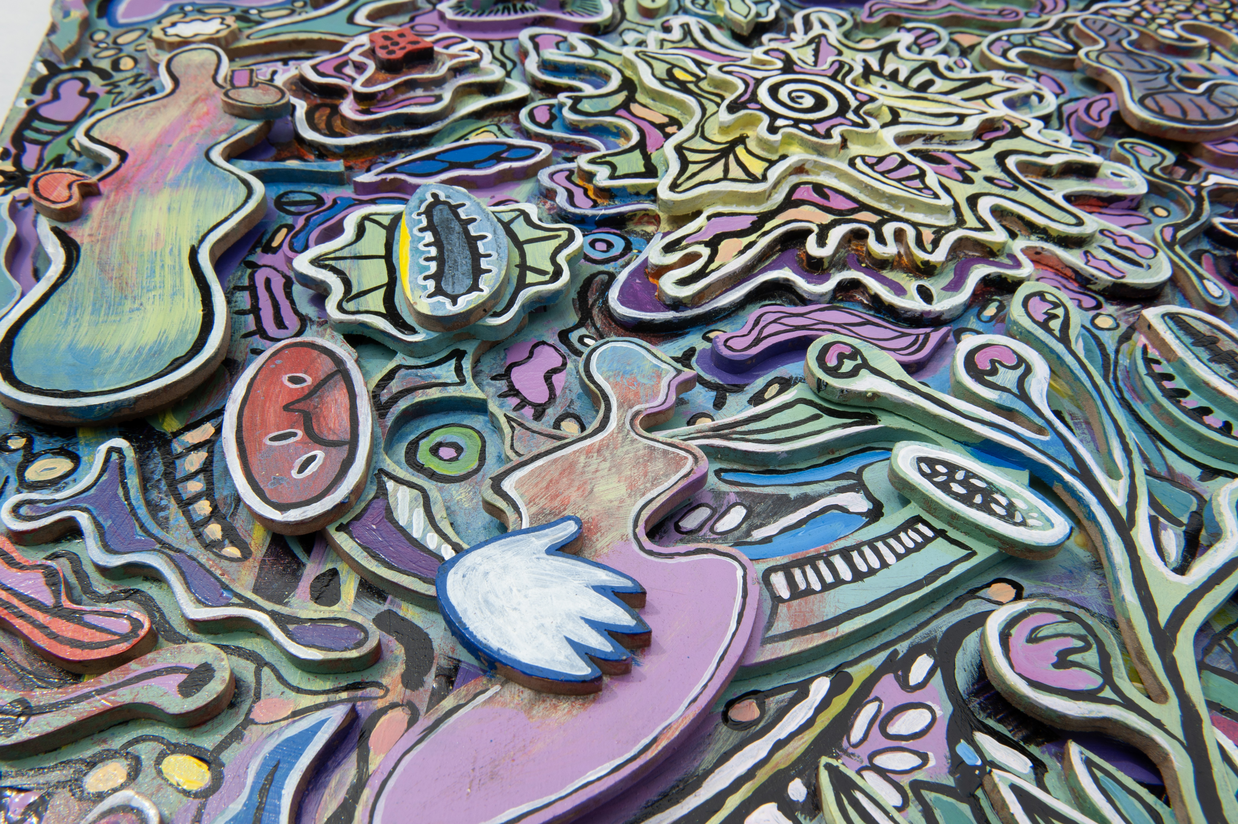 sun floated at the centre, carved in spirals and stitched lines, as though